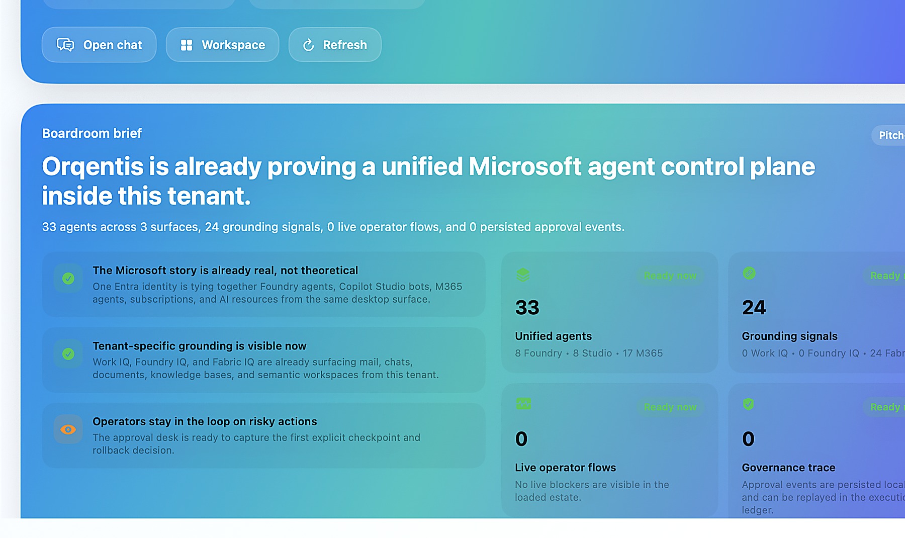 Orqentis pulls Azure AI Foundry, Microsoft 365 Copilot, Copilot Studio, and Fabric into one native workspace with a full dashboard, a compact tray command center, and a built-in Trust Center for launch readiness.